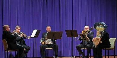 In the intimate setting of a small music hall, Foothills Brass players take the stage show the range of brass instruments from crisp to warm – bright to mellow – powerful to